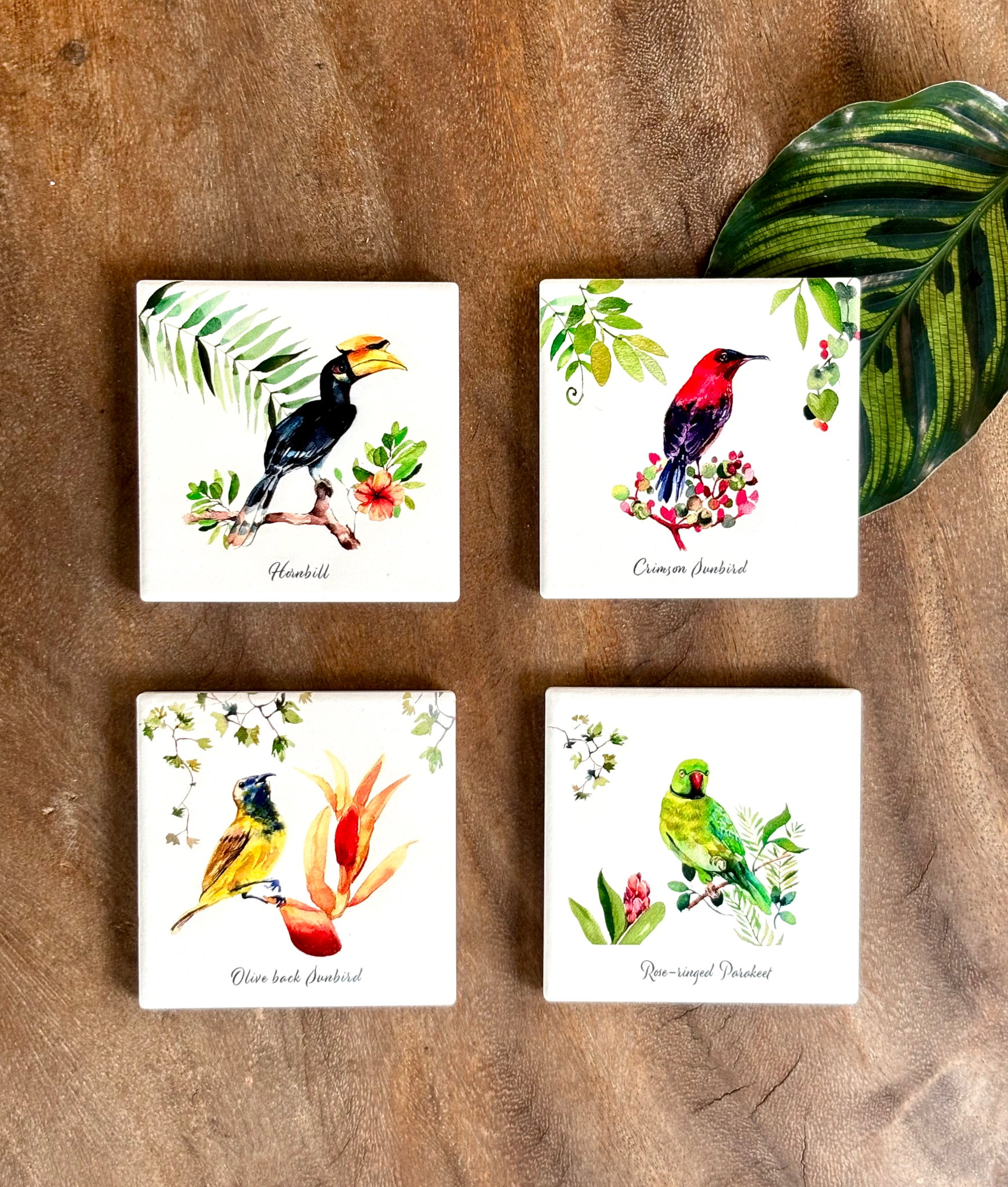 4 different birds: the crimson sunbird, the olive back sunbird, the parakeet and the hornbill